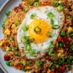 Picture a perfectly fried golden rice, its grains slightly crisp at the edges, glistening with a touch of soy sauce. The vibrant colors of sweet bell peppers, tender peas, and earthy carrots weave together like a patchwork quilt, enticing you with their freshness. Just as you take your first forkful, the warm, savory notes of sesame oil envelop you, while the faint zing of green onions adds a delicate lift. This isn’t just breakfast; this is happiness served on a plate.