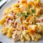 The aroma drifts through your kitchen, a warm embrace of savory goodness that beckons all to gather. As you place the bubbling casserole onto the dining table, the golden, crunchy topping sparkles under the soft light. The first forkful reveals a delightful contrast of textures: the creamy filling hugs tender pasta, crispy bits of buttery crackers offering a satisfying crunch, while succulent bites of chicken and ham interlace with the smooth, rich flavors of Swiss cheese. Instantly, your senses awaken to a comforting feast that feels both homely and indulgent. This is not just a meal; it’s a delightful experience, a memory waiting to be made.