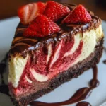 A rich and creamy chocolate strawberry swirl cheesecake with a crunchy graham cracker crust and vibrant strawberry puree swirls.