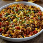- In a baking dish, layer the beef mixture, followed by the crushed tortilla chips.