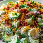 As you prepare to dive into this salad, you can anticipate the way the aromas will tease you, weaving together the fresh scent of garden-popped cucumbers with the more robust notes of cheese and ranch dressing. It invites nostalgia—a comforting reminder of backyard barbecues and sunny afternoons, where each bite feels like a mini-celebration. The colors are just as inviting; the light green hues of the cucumbers mixed with the golden shimmer of cheddar and the crispy appeal of bacon create a dish that’s as beautiful as it is delicious.