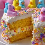 A whimsical and vibrant dessert that brings joy to any gathering, featuring a moist yellow cake decorated with colorful Marshmallow Peeps.