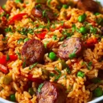 A comforting one-pot meal featuring savory sausage, fluffy rice, and colorful vegetables, perfect for a cozy evening.