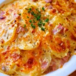 A comforting casserole layered with scalloped potatoes, savory ham, and melting cheese, perfect for family gatherings or cozy dinners.