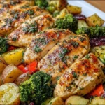 A simple and comforting one-pan dish featuring juicy chicken, roasted potatoes, and seasonal vegetables, all coated in a luscious garlic butter sauce.