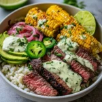 Each bite of a Steak, Avocado, and Roasted Corn Bowl with Cilantro Cream Sauce invites you on a tantalizing journey of flavor and texture. Imagine sinking your fork into a vibrant medley of perfectly seared steak, luxurious avocado, and sweet, smoky roasted corn, all resting serenely on a bed of fluffy rice. The crispy, caramelized edges of the corn contrast beautifully with the tender, juicy steak while the creamy avocado adds a softness that wraps around each mouthful like a warm hug. And let’s not forget the show-stopping cilantro cream sauce—its lush, herbaceous notes elevate this dish into an unforgettable experience. It dances on your palate, a zesty drizzle that ties all the elements together.