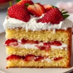 A delightful layered shortcake featuring moist sponge cake, luscious whipped cream, and fresh strawberries, perfect for any celebration.