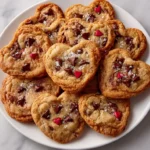 Delicious heart-shaped chocolate chip cookies perfect for Valentine’s Day.